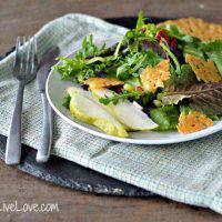 This salad is scoring some serious points with me. I love fruit and nuts in salad and the Parmesan crisps look like the perfect compliment…I’m ready to dig in.
