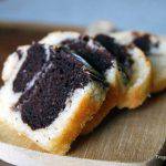 Now with a knife make a few passes horizontally and vertically to swirl in the cocoa batter to the vanilla batter. I did about three passes each way but I think a few more would have worked out better.